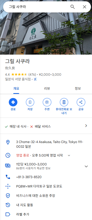 아사쿠사 지역에 위치한 비프스튜 맛집, 그릴 사쿠라.